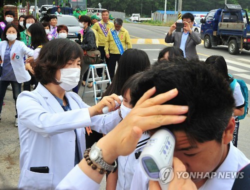 | △ '이젠 학교 갑니다' (포항=연합뉴스) 메르스 사태로 지난 15일부터 휴업에 들어갔던 포항 기계 중·고가 22일부터 정상수업에 들어갔다. 만일을 대비해 보건소 직원들이 등교학생들의 체온을 재고 있다. 2015.6.22 shlim@yna.co.kr |