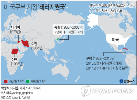 미국 국무부는 19일(현지시간) 의회에 제출한 '2014년 테러보고서'에서 쿠바·이란·시리아·수단 등 4개국을 '테러지원국'(State Sponsors of Terrorism)으로 지정했다.