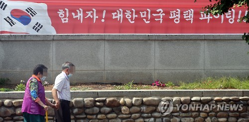 | △ 메르스 "함께 이겨냅시다" (평택=연합뉴스) 신영근 기자 = 12일 오전 중동호흡기증후군(메르스) 환자 경유병원인 경기도 평택굿모닝병원 앞 평택시민을 위한 '힘내자! 대한민국 평택 파이팅!!' 현수막 앞을 노부부로 보이는 시민들이 마스크를 착용한 채 손을 잡고 걷고 있다. 보건당국은 그러나 평택굿모닝병원에서 14번 환자와 관련된 3명이 확진 판정을 받았다고 밝혀 메르스가 거의 끝난 것으로 알고 있던 평택시민들은 당혹해하고 있다. 2015.6.12 drops@yna.co.kr http://blog.yonhapnews.co.kr/geenang |