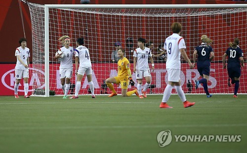 | △ 무너지는 대한민국 (몬트리올=연합뉴스) 신준희 기자 = 22일 오전(한국시간) 캐나다 몬트리올 올림픽 스타디움에서 열린 2015 캐나다 여자 월드컵 16강전 한국과 프랑스의 경기. 프랑스에 세번째 골을 내준 한국 선수들이 아쉬워하고 있다. 2015.6.22 hama@yna.co.kr |