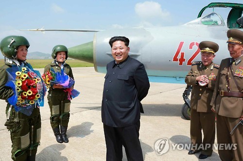 | △ 북한 첫 여성 초음속전투기 조종사 치하하는 김정은 (서울=연합뉴스) 북한 최초의 여성 초음속전투기 비행사인 림설(왼쪽 첫번째)과 조금향(왼쪽에서 두 번째)이 시범 훈련직후 김정은 국방위원회 제1위원장으로부터 직접 축하를 받았다고 22일 노동신문이 보도했다. 신문은 김 제1위원장이 이들에 대해 "기특하다", "하늘의 꽃이다"라는 등의 말로 격찬했다고 전했다. 조금향과 림설은 지난해 11월 김 제1위원장이 항공 및 반항공군(공군)의 첫 여성 전투기 조종사의 훈련 참관 때 '불사조'라는 치하를 받은 바 있다. 2015.6.22 nkphoto@yna.co.kr |