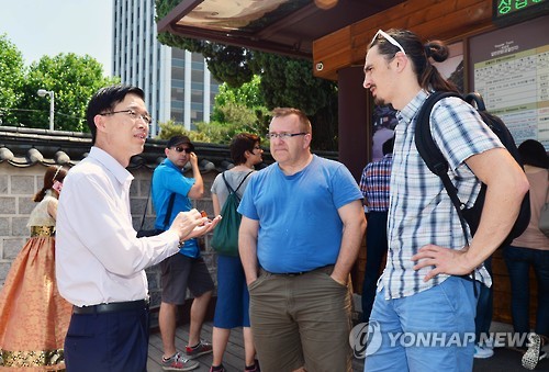 | △ 메르스 여파 관광 동향 점검하는 방문규 차관 (서울=연합뉴스) 방문규 기획재정부 차관이 21일 중동호흡기증후군(메르스) 여파로 위축된 관광산업 동향을 점검하기 위해 서울 종로구 와룡동 창덕궁을 방문해 외국인 관광객에게 메르스에 대한 정부의 대응 노력을 설명하고 있다. (기획재정부 제공 ) |