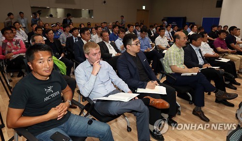 | △ 세월호 선체인양 관심업체 대상 사업설명회 (세종=연합뉴스) 배재만 기자 = 해양수산부가 29일 오후 정부세종청사 1동 103호에서 세월호 선체인양 입찰에 관심 있는 국내외 업체들을 한자리에 모아 개최한 사업설명회에서 참가한 업체 관계자들이 설명을 듣고 있다. 해수부는 이날 세월호 선체 기술검토 및 현장조사결과를 발표하고 기술제안서 작성요령과 평가방식에 대한 정보를 제공한다. 입찰 참가업체의 기술제안서는 6월23일 오후 2시까지 접수하며 그 이후 기술평가가 시작된다. 2015.5.29 scoop@yna.co.kr http://blog.yonhapnews.co.kr/f6464 |