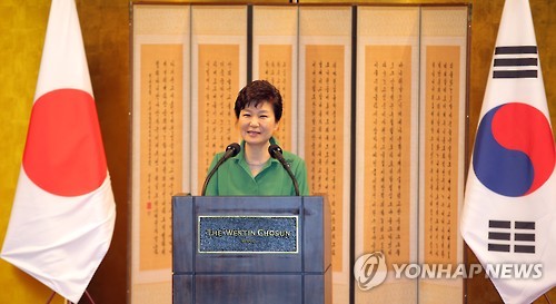 | △ 박 대통령, "과거사 짐 화해로 내려놓자" (서울=연합뉴스) 이정훈 기자 = 박근혜 대통령이 22일 오후 서울 중구 소공동 웨스틴조선호텔에서 주한 일본대사관 주최로 열린 한일 국교정상화 50주년 기념 리셉션에서 축사를 하고 있다. 박 대통령 뒤로 한일기본조약 비준시 사용된 병풍이 서있다. |