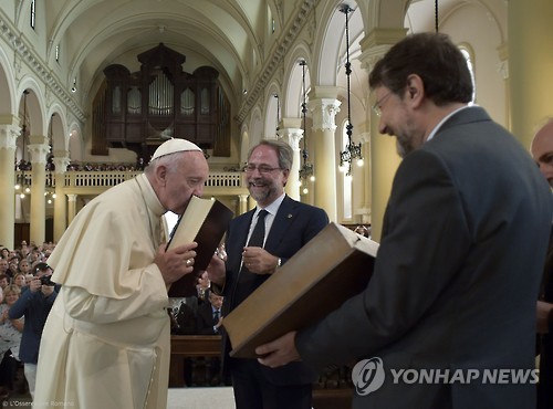 (제네바=연합뉴스) 류현성 특파원 = 프란치스코 교황은 이탈리아 북부 도시 방문 이틀째인 22일(현지시간) 교황으로서는 처음으로 중세에 종교적 박해를 받았던 개신교 교회를 방문해 용서를 구했다.