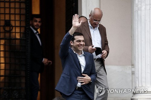 | △ (AP=연합뉴스) 알렉시스 치프라스 그리스 총리가 유로존 정상회의를 하루 앞둔 21일 총리실을 나서면서 지지자들에게 손을 흔들고 있다. |
