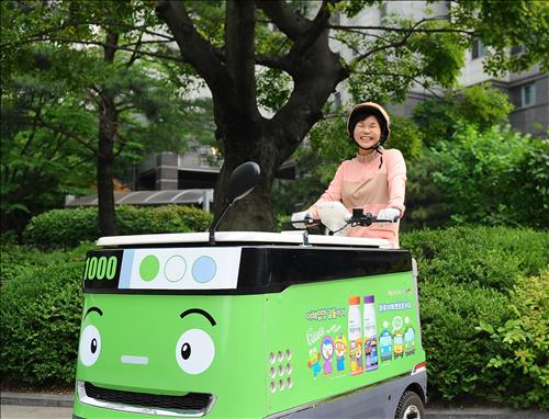 하지만 그로부터 8년이 지난 지금, 이 씨는 미래형 '1인 자동차'를 연상시키는 전동 카트를 타고 송파구 잠실 지역 골목 골목을 누비고 있다. 지난 3월부터 탑승용 전동카트를 배정받았는데, 이 전기자동차는 사람을 태우고 도보의 두 배 속도인 8㎞까지 낼 수 있다. 웬만한 경사의 언덕도 별 무리없이 올라가고, 냉장 기능을 갖춰 야쿠르트(65㎖) 3천300개(220ℓ 카트냉장고 기준)를 여름철에도 신선하게 보관할 수 있다.