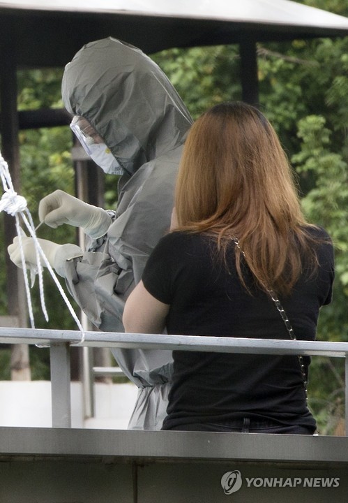 | △ '저 괜찮겠죠' (서울=연합뉴스) 윤동진 기자 = 중동호흡기증후군(메르스) 사태가 장기화 국면에 접어든 가운데 22일 오후 강남구 삼성서울병원 주차장에 설치된 메르스 대응 시설물에서 한 시민이 검사를 받고 있다. 2015.6.22 mon@yna.co.kr |