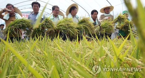 | △ 가뭄 속 올 첫 벼 수확 (이천=연합뉴스) 신영근 기자 = 23일 오전 경기도 이천시 호법면 안평리 비닐하우스 논에서 올 첫 벼 수확이 진행되고 있다. 이날 수확한 벼는 지난 2월 4일 모내기한 극조생종 품종으로 인근 광역쓰레기 소각장에서 나오는 폐열을 이용해 재배했으며 수확량은 320㎏ 정도다. 2015.6.23 drops@yna.co.kr http://blog.yonhapnews.co.kr/geenang |