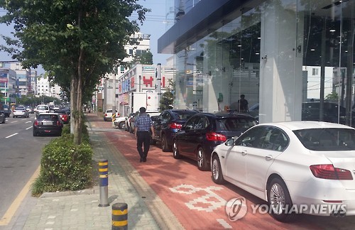 | △ 인도에 주차된 수입승용차들 (울산=연합뉴스) 허광무 기자 = 23일 울산시 남구의 한 수입차 전시장 앞 인도에 전시장을 홍보하는 차량 2대를 비롯해 수입승용차 6대가 줄지어 주차돼 있다. 2015.6.23 hkm@yna.co.kr |