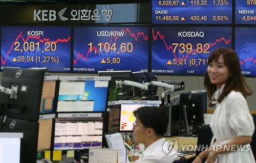 (서울=연합뉴스) 임수정 기자 = 코스피가 23일 그리스의 디폴트(채무 불이행) 우려가 완화된 데 힘입어 2,080선 위로 껑충 뛰어올랐다.