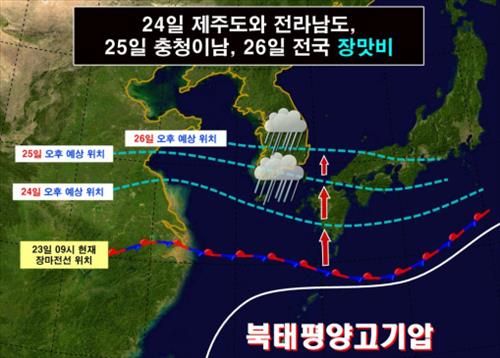 기상청은 "23일 오전 9시 기준 제주도 남쪽 먼바다에 위치한 장마전선이 24일 제주, 25일 남해안, 26일 남부지방까지 북상할 것으로 전망된다"고 밝혔다.