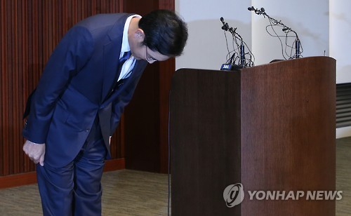 | △ '메르스 사태' 삼성 이재용 대국민사과 (서울=연합뉴스) 임헌정 기자 = 삼성전자 이재용 부회장이 23일 오전 서울 서초동 삼성전자 서초사옥에서 중동호흡기증후군(메르스) 사태와 관련한 입장을 발표하기에 앞서 고개숙여 사과하고 있다. 이날 삼성은 삼성서울병원과 관련해 대국민 사과와 함께 그룹 차원의 지원 대책을 발표했다. 삼성은 삼성생명공익재단 산하 삼성서울병원에서 슈퍼전파자가 나와 메르스 2차 유행의 진앙이 됐고 급기야 병원 부분 폐쇄에까지 이르자 관련 대책을 논의해 왔다. kane@yna.co.kr |