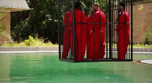 IS와 연계된 소셜네트워크(SNS) 계정을 통해 23일(현지시간) 유포되기 시작한 동영상엔 붉은색 죄수복을 입은 남성 4명이 갇힌 철창이 크레인에 매달려 서서히 수영장에 잠기는 장면이 담겼다.