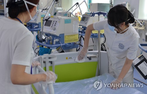 | △ 을지대병원 중환자실 소독 (대전=연합뉴스) 중동호흡기증후군(메르스) 대응을 위한 격리 조처가 해제된 23일 대전 서구 을지대학교병원에서 직원이 환경 소독을 하고 있다. 2015.6.23 << 을지대학교병원 >> walden@yna.co.kr |