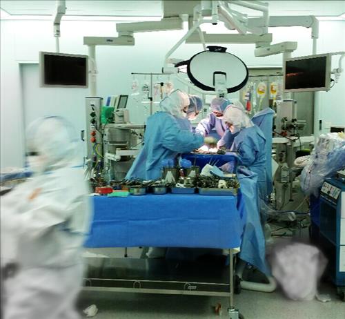 | △ 분당서울대병원 의료진이 방호복 등을 겹겹이 입은 채 간이식 수술을 하고 있다.<분당서울대병원 제공> |