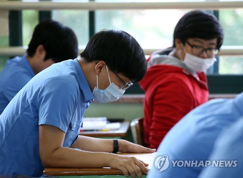| △ '모의평가 때도 마스크' (서울=연합뉴스) 박동주 기자 = 대학수학능력시험 모의평가가 시행된 4일 오전 서울 종로구 경복고등학교에서 마스크를 쓴 학생이 시험을 준비하고 있다. 2015.6.4 pdj6635@yna.co.kr |