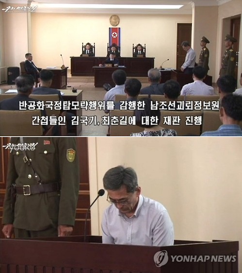(서울=연합뉴스) 오예진 기자 = 북한은 무기징역형을 선고받은 남한 국민 김국기씨와 최춘길씨가 전날 북한 최고재판소 법정에서 최종 진술을 하는 동영상을 24일대남용 매체인 우리민족끼리TV를 통해 공개했다.