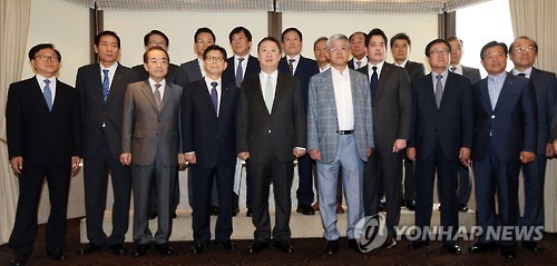 | △ 기념촬영하는 회장단 (서울=연합뉴스) 박동주 기자 = 22일 오전 서울 롯데호텔에서 열린 대한·서울 상공회의소 회장단 긴급간담회에 앞서 박용만 대한상의 회장(앞줄 가운데) 등 참석자들이 기념촬영을 하고 있다. pdj6635@yna.co.kr |