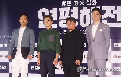 | △ 영화 '연평해전' 주역들 (서울=연합뉴스) 홍기원 기자 = 배우 진구(왼쪽부터), 이현우, 김학순 감독, 김무열이 1일 오후 서울 성동구 행당동 CGV 왕십리에서 열린 영화 '연평해전' 언론시사회에서 포즈를 취하고 있다. 2015.6.1 xanadu@yna.co.kr |