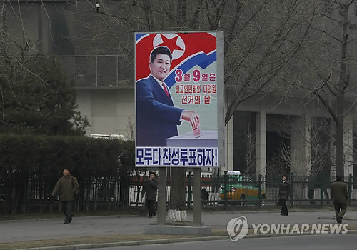 | △ In this Monday Feb. 24, 2014 photo, North Koreans walk past an election poster that reads: "March 9 is the election of the 13th Supreme People’s Assembly, Let’s all vote in agreement!" in Pyongyang, North Korea. North Korean voters will make a choice Sunday, March 9 when they elect a new national legislature, but not for a candidate. The ruling elite have already done that for them, and there’s only one per district. (AP Photo/Vincent Yu) |