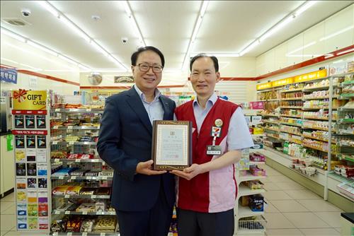 | △ 세븐일레븐 정승인 대표이사(왼쪽)와 편의점 점주 나기열 씨가 표창장을 들고 기념사진을 찍고 있다. |