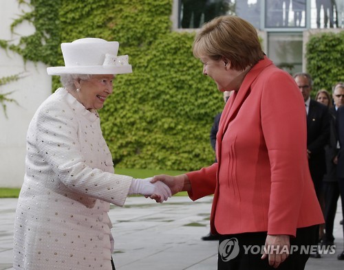 | △ Britain� Queen Elizabeth II, left, and Germany's Chancellor Angela Merkel shake hands as they meet in Germany's capital Berlin, Wednesday, June 24, 2015. Queen Elizabeth II and her husband Prince Philip are on an official visit to Germany until Friday, June 26. (AP Photo/Michael Sohn) |