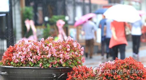 | △ 장마시작 활짝 웃는 꽃들 (제주=연합뉴스) 변지철 기자 = 24일 제주에 장마가 시작된 가운데 제주시 연동 바오젠거리에 있는 화단 너머로 사람들이 우산을 쓰고 지나가고 있다. |