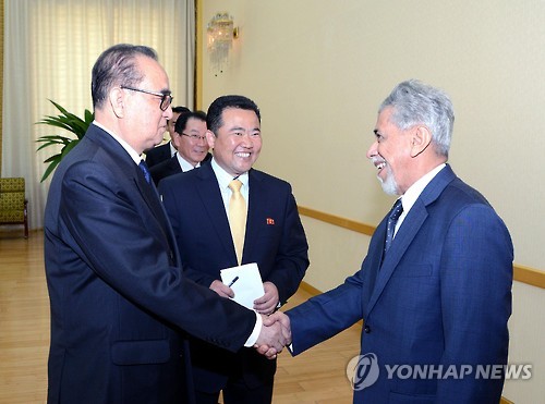 | △ 오만외무성대표단과 악수하는 리수용 외무상 (평양 조선중앙통신=연합뉴스) 리수용 외무상이 28일 만수대의사당에서 아흐마드 빈 유씨프 오바이드 알 하르시 부상을 단장으로 하는 오만외무성대표단을 만나 대화를 했다고 조선중앙통신이 보도했다. 2015.5.28 photo@yna.co.kr |