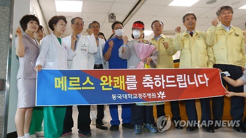 | △ '집으로 갑니다' (경주=연합뉴스) 김준범 기자 = 22일 경북에서 첫 중동호흡기증후군(메르스) 확진을 받아 동국대 경주병원에서 격리 치료를 받은 A(59)씨가 완치돼 퇴원하며 관계자들과 기념사진을 찍고 있다. 2015.6.22 psykims@yna.co.kr |