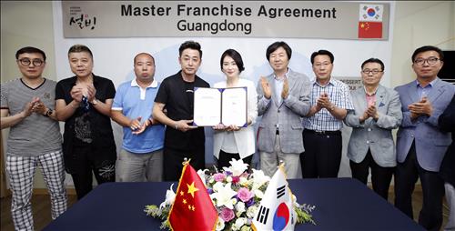 | △ 정선희 설빙 대표와 위용 중국 광주페이룡유한회사 대표(가운데)가 26일 서울 송파구 설빙 본사에서 중국 광둥성 지역에 올해 안에 매장 20개를 열고 향후 5년간 150개로 확대하는 내용의 마스터 프랜차이즈 양해각서를 체결한 뒤 기념사진을 촬영하고 있다. |