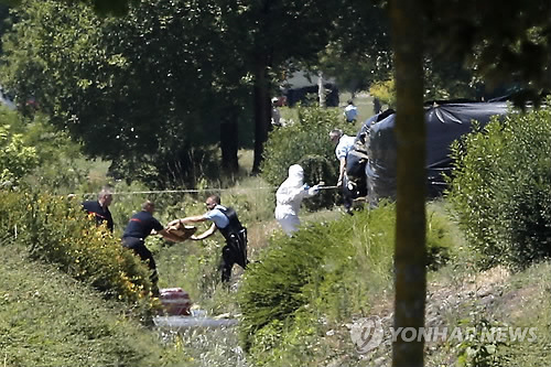 | △ 프랑스서 이슬람 테러 추정 공격으로 1명 '참수' (생 캉탱 팔라비에<프랑스> AP=연합뉴스) 26일(현지시간) 이슬람 테러로 추정되는 사건이 발생한 프랑스 리옹 남동부 생 캉탱 팔라비에소재 가스 공장 외곽에서 경찰이 증거물을 확보하며 수사에 나서고 있다. 범인 2명이 이날 오전 10시께 가스 공장 정문을 차로 충돌한 뒤 폭발이 일어났으며 공장 부근에서 참수된 시신 한 구가 발견됐다. 시신 머리에 아랍어 글귀가 적혀 있었으며 시신 주변에서 아랍어 깃발도 발견된 것으로 전해졌다. bulls@yna.co.kr |