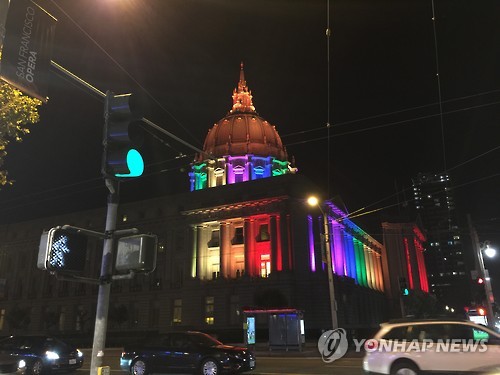 | △ '동성애자 권리 지지' 무지개빛 조명 켠 샌프란시스코 시청 (샌프란시스코=연합뉴스) 임화섭 특파원 = 미국 대법원이 동성 결혼 허용을 미국 전역으로 확대하는 역사적 판결을 선고하기 전날인 25일(현지시간) 늦은 밤 미국 샌프란시스코의 시 청사가 동성애자 인권을 상징하는 무지개빛 조명으로 빛나는 가운데 그 앞 횡단보도에 녹색 등과 보행 신호등이 켜져 있다. 2015.6.26 solatido@yna.co.kr |
