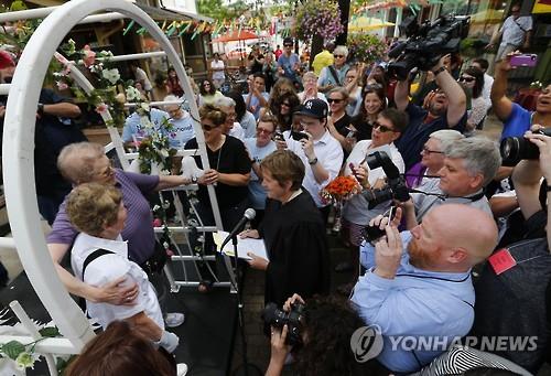 | △ 43년간 커플로 지내온 마지 에이드(77.오른쪽)와 앤 소럴(78) 레즈비언 커플이 26일(현지시간) 미국 미시간 주 앤아버에서 연방대법원의 동성결혼 합헌 및 전국 허용 결정 이후 지인들의 축하 속에 결혼식을 올렸다. (AP=연합뉴스) |
