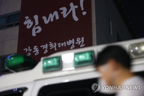 | △ '힘내라!' (서울=연합뉴스) 김주성 기자 = 중동호흡기증후군(메르스) 확진 환자 3명이 추가된 21일 확진자가 나온 서울 강동경희대병원 외벽에 '힘내라!'라고 적힌 대형 현수막이 걸려 있다. 2015.6.21 utzza@yna.co.kr |