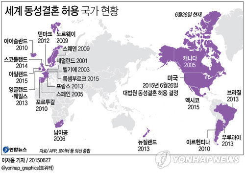 그간 동성결혼을 불허한 미국 14개 주의 동성 짝들은 연방대법원의 판결 직후 동성결혼 허가증을 받으러 법원으로 즉각 달려갔다.