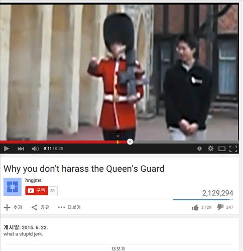 '영국왕실 근위병을 괴롭히면 안 되는 이유'라는 제목으로 유튜브에 올라있는 영상을 보면 근위병의 정색을 한 대응에 관광객은 화들짝 놀란 뒤 달아났다.