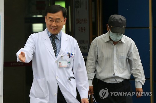 | △ 일상으로 돌아가는 메르스 환자 (대구=연합뉴스) 김준범 기자 = 26일 오전 중동호흡기증후군(메르스) 완치 판정을 받은 A(52)씨가 담당 의사인 김신우 감염내과 교수의 안내를 받으며 대구시 중구 삼덕동 경북대학교병원에서 퇴원하고 있다. 2015.6.26 psykims@yna.co.kr |