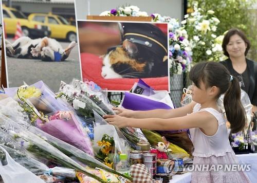| △ (와카야마현<일본> 교도=연합뉴스) 28일 일본 와카야마(和歌山)현의 명물이었던 '고양이 역장' 다마의 장례식에 약 3천명이 다녀갔다. 한 소녀가 헌화하는 모습이다. 2015.6.28 |