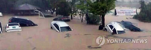 | △ (부산=연합뉴스) 작년 8월시간당 100mm가 넘는 집중호우가 내린 부산 기장군에서 주차 차량들이 침수돼 있다. 2014.8.25 << 지방 기사 참고, 독자 제공 >> osh9981@yna.co.kr |