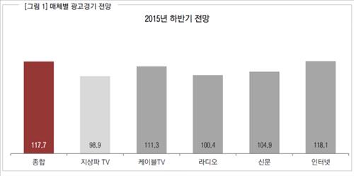 매체별 지수는 지상파TV 98.9, 케이블TV 111.3, 라디오 100.4, 신문 104.9, 인터넷 118.1로, 지상파TV 광고는 소폭 감소세가 예상됐다.
