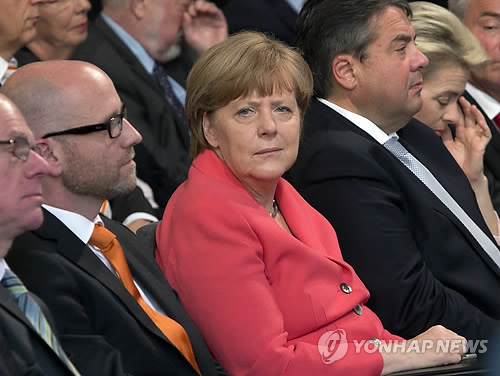 | △ '그리스'해법, '저' 손 안에… (베를린 AP=연합뉴스) 채무 불이행(디폴트)과 유로존 이탈(그렉시트) 위기로 치닫고 있는 그리스의 야니스 바루파키스 재무장관은 29일(현지시간) 언제든지 다시 협상 테이블에 앉을 자세가 돼 있다고 강조하고 메르켈 독일 총리가 위기 해법의 열쇠를 쥐고 있다며 그의 결단을 촉구했다. 그리스에 대한 최대 채권국이자 유럽연합(EU)과 유로존(유로화 사용 19개국)의 최대 경제국인 독일이 움직여야만 돌파구가 열릴 것이라는 메시지. 사진은 이날 메르켈(가운데) 총리가 집권 기독교민주당(CDU) 창당 70주년 리셉션에 참석한 모습. |
