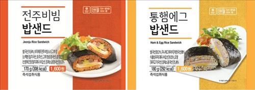 '밥 샌드'는 삼각김밥과 샌드위치를 합친 제품으로 전주비빔 삼각김밥에 계란후라이와 모둠 전을 결합한 '전주비빔 밥샌드'(1천600원)와 햄에그모닝머핀 샌드위치에 빵 대신 밥과 김을 넣은 '통햄에그 밥샌드'(1천600원) 2종으로 선보였다.