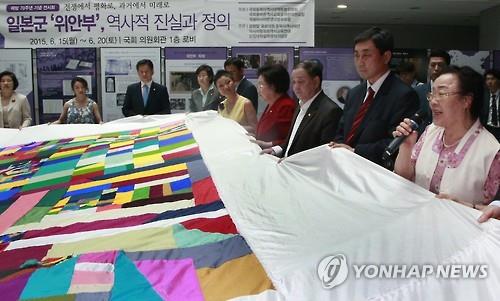 | △ 일본군 위안부 피해자 이용수 할머니가 2015년 6월 15일 한국 국회 의원회관에서 열린 해방 70주년 기념 전시회 '일본군 위안부, 역사적 진실과 정의'에서 발언하고 있다. (연합뉴스 자료사진) |