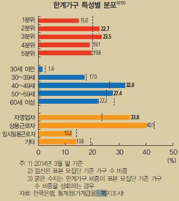 한계가구 중에 소득 4∼5분위 고소득층이 38.9%나 포함됐는데 이들의 금융부채 규모는 전체 한계가구 금융부채의 63.1%(전체 가계금융부채의 20.6%)에 달했다.