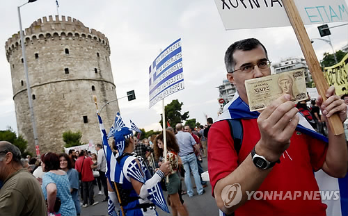 | △ 다시 등장한 옛 그리스 화폐 드라크마 (테살로니키<그리스> AP=연합뉴스) 국제채권단과의 협상결렬로 그리스 위기가 고조되는 가운데 29일(현지시간) 그리스 북부 항구 도시 테살로니키에서 국제채권단 제안 거부 집회가 열려 한 참가자가 1천 드라크마 짜리 예전 그리스 화폐를 들어보이고 있다. 그리스 사태가 디폴트(채무불이행)에 이어 유로존 탈퇴까지 진행되면 유로화 대신 드라크마가 재도입될 가능성이 크다. marshal@yna.co.kr |