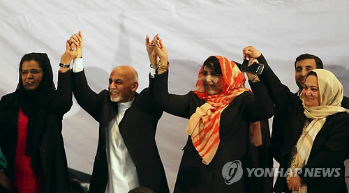 | △ 2014년 9월 22일 아슈라프 가니 아프가니스탄 당시 대통령 당선인(왼쪽 2번째)이 카불에서 여성 지지자들의 손을 잡고 있다. 가니는 이날 여성들이 정부 최고위직에 오르기를 희망한다면서 대법관에 여성을 기용할 것을 약속했고 9개월이 지나 실제로 여성 대법관 후보자를 지명했다.(AP=연합뉴스 자료사진) |