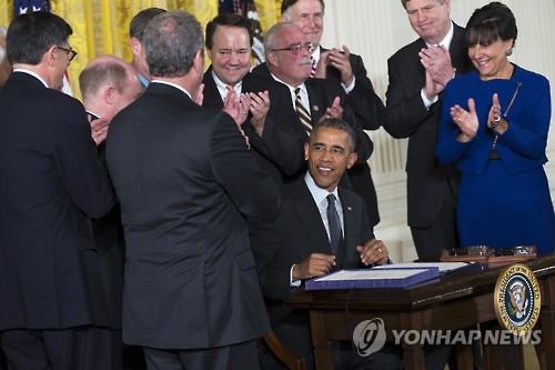 | △ (AP=연합뉴스) 버락 오바마 미국 대통령이 29일(현지시간) TPA와 TAA 등 TPP 관련 법안에 서명한 뒤 박수를 받고 있다. |