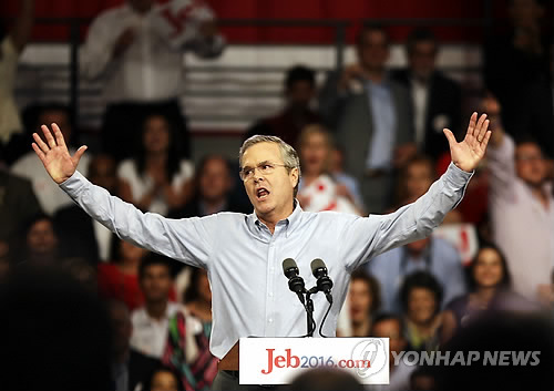 | △ 젭 부시, 美 대선출마 선언 (마이애미 AP=연합뉴스) 미국 공화당의 유력 대선주자로 꼽히는 젭 부시 전 플로리다 주지사(62)가 15일(현지시간) "워싱턴을 뜯어고치겠다"며 2016년 대선 출마를 공식 선언했다. 공화당 주자 가운데 11번째. 41대 조지 H.W. 부시 전 대통령의 차남이자 43대 조지 W. 부시 전 대통령의 동생이다. 사진은 부시(가운데) 전 주지사가 이날 고향 플로리다주 마이애미 데이드 칼리지에서 출사표를 던지며 지지자들에게 손을 들어 보이는 모습. bulls@yna.co.kr Former Florida Gov. Jeb Bush waves to the crowd as he formally joins the race for president with a speech at Miami Dade College, Monday, June 15, 2015, in Miami. (AP Photo/David Goldman) |