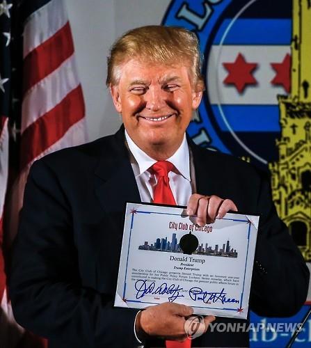 | △ 미국 대통령선거 후보인 도널드 트럼프가 29일(현지시간) 시카고에서 강연을 하고 있다.(EPA=연합뉴스) |